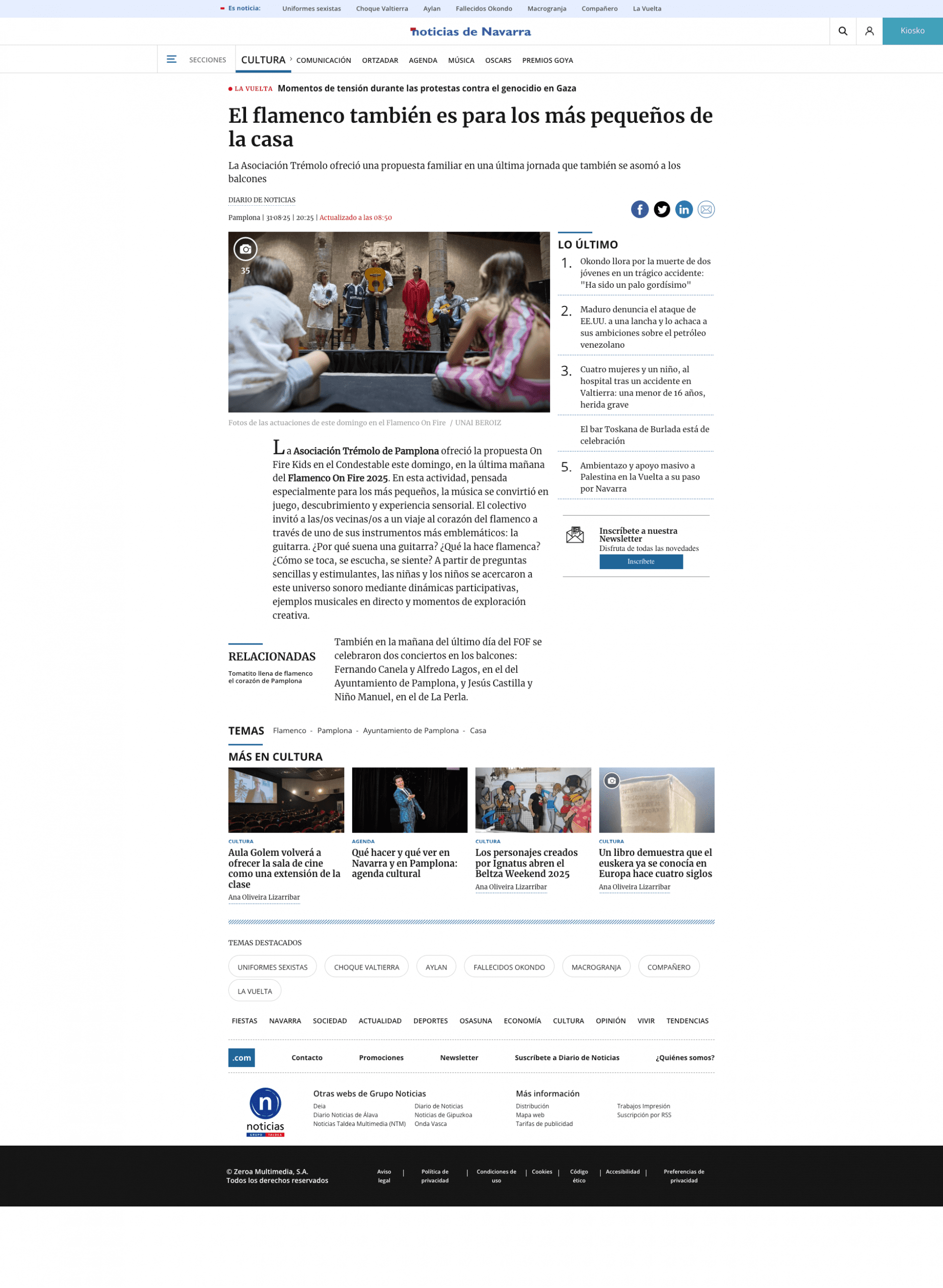 Estamos muy felices de compartir con vosotros que nuestro trabajo ha tenido presencia en la prensa. El Diario Noticias de Navarra recogió la propuesta que llevamos a cabo junto a la Asociación Trémolo de Pamplona en el marco del Flamenco On Fire 2025.